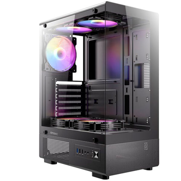 El Antec VCX300 RGB Elite es un chasis mid-tower pensado para exhibir tus componentes con estilo, gracias a su panel frontal y lateral de vidrio templado de 270°. Incluye iluminación ARGB fija con cuatro ventiladores preinstalados (tres en el lateral y uno en la parte trasera) para un ambiente visual muy llamativo. Soporta tarjetas gráficas de hasta 420 mm, disipadores de CPU de hasta 170 mm y fuentes de poder ATX de hasta 245 mm. Ofrece compatibilidad para placas madre ATX, mATX e ITX, múltiples opciones de montaje para ventiladores y radiadores líquidas, además de espacio generoso para un buen orden de cables gracias a sus 27 mm de recorrido posterior.